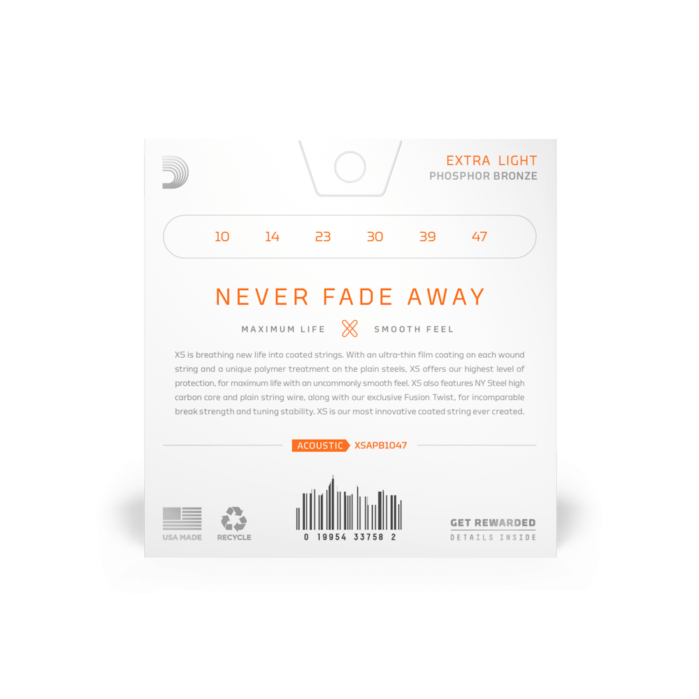 - XS Phosphor Bronze strings have the longest life of any D’Addario acoustic string, thanks to the ultra-thin XS film coating.