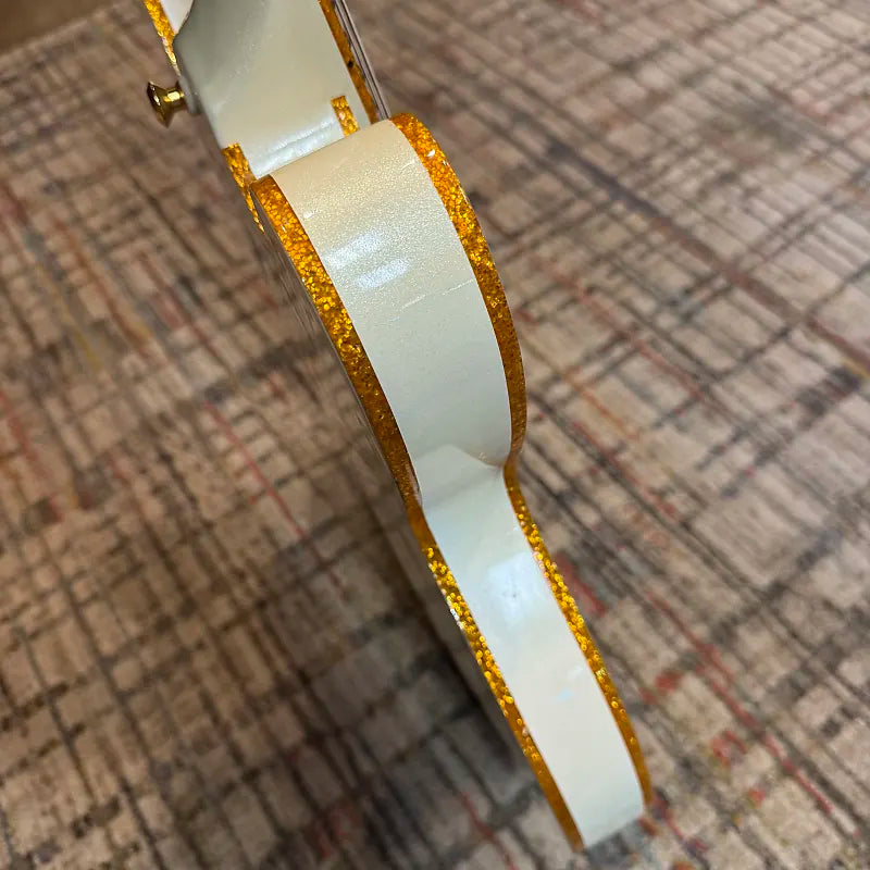 For sale from Metz Music is this very clean and super cool Epiphone Riviera P93 with hardshell case. This guitar is gorgeous in every aspect from its Pearl White finish with metallic gold binding and hardware to the bigsby vibrato and paralellogram inlays. This one has a ton of mojo and those 3 P-90 pickups give you a huge range of tones from classic jazz to crunchy rock. We have this one set up and playing its best!